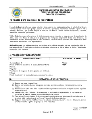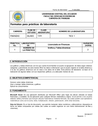 Este documento proporciona instrucciones para una práctica de laboratorio sobre tablas y gráficos dinámicos en Excel. Explica cómo crear una tabla dinámica a partir de datos en una hoja de cálculo, así como cómo crear un gráfico dinámico en función de los datos de la tabla. La práctica tiene como objetivo que los estudiantes aprendan a usar y manejar tablas y gráficos dinámicos y aplicar estos conocimientos.