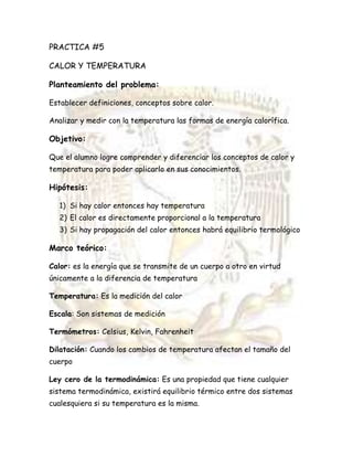 Este documento presenta tres experimentos sobre calor y temperatura realizados por estudiantes. El primero demuestra que al calentar agua su temperatura aumenta. El segundo muestra que un tubo de metal al ser calentado alcanza un equilibrio térmico. El tercero comprueba que la temperatura de dos muestras de agua calentadas por tiempos diferentes depende directamente de la cantidad de calor aplicada.