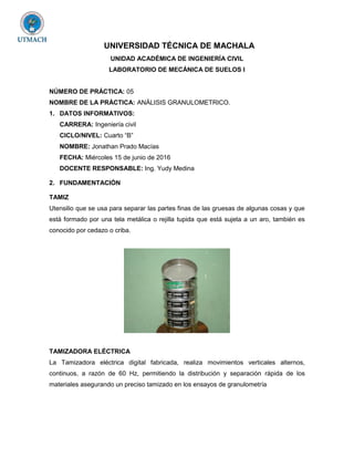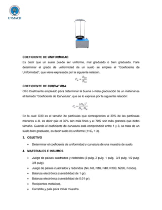 Este documento describe una práctica de laboratorio realizada por un estudiante de ingeniería civil para determinar el coeficiente de uniformidad y curvatura de una muestra de suelo a través de un análisis granulométrico utilizando tamices. El estudiante tomó una muestra de suelo, la tamizó durante 15 minutos, pesó los contenidos de cada tamiz y calculó que el coeficiente de uniformidad fue de 14.285 y el coeficiente de curvatura fue de 0.516.