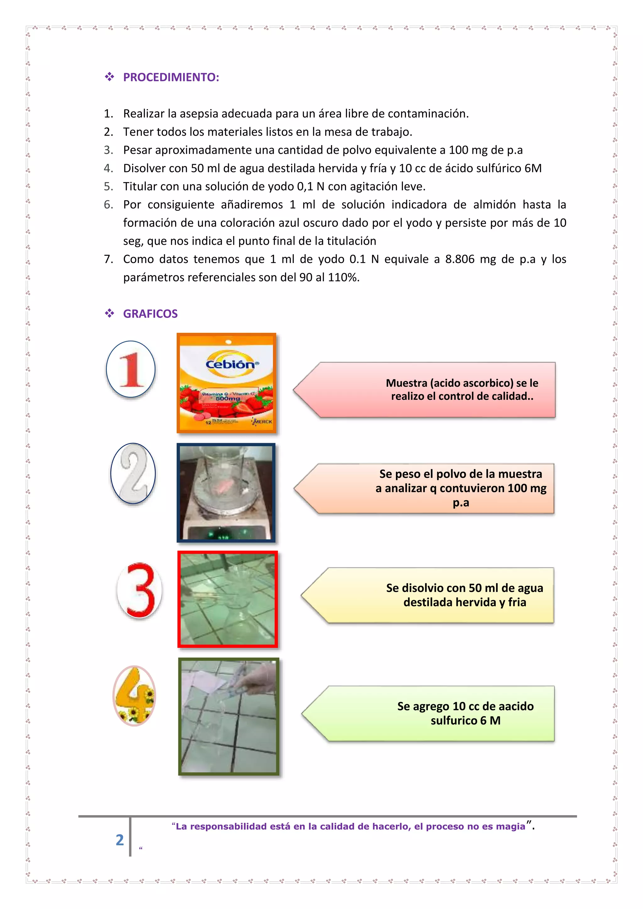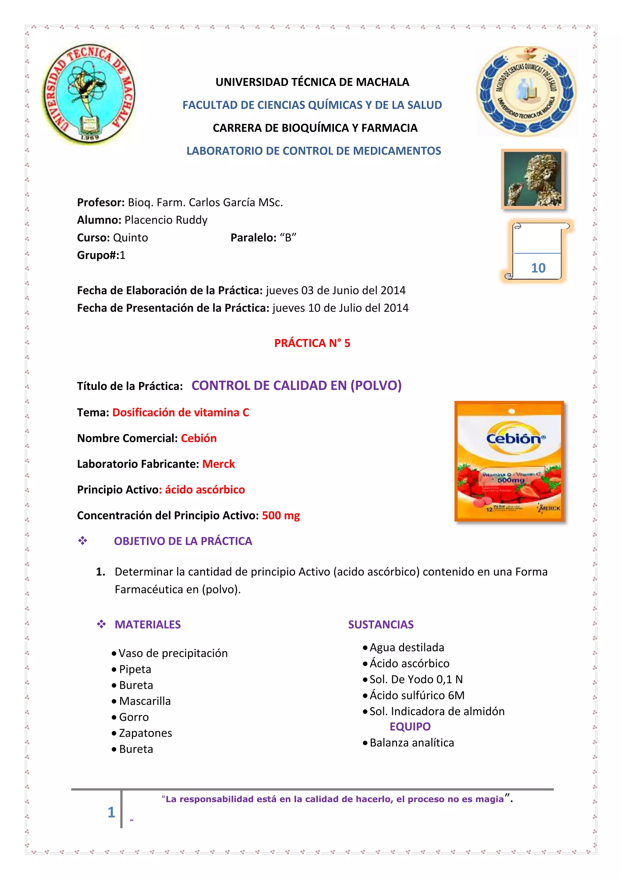 Este documento presenta los resultados de un análisis de control de calidad realizado a un polvo de vitamina C (ácido ascórbico) llamado Cebión. El resumen describe el procedimiento de titulación llevado a cabo, los cálculos realizados para determinar el porcentaje real de principio activo y la conclusión de que el producto cumple con los parámetros de referencia establecidos.