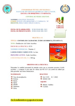 El documento describe un experimento para determinar el contenido de ácido ascórbico (vitamina C) en tabletas mediante volumetría. Se pesaron y trituraron 4 tabletas, se disolvieron en agua y ácido sulfúrico, y se tituló la muestra con yodo. El porcentaje real de ácido ascórbico fue del 106.55%, dentro del rango de control de calidad del 90-110%.