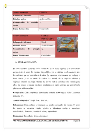 Este documento presenta los resultados de un análisis de calidad realizado a medicamentos que contienen ácido ascórbico como principio activo. Se evaluaron las características organolépticas, el tiempo de efervescencia, la dureza, la friabilidad, la desintegración y el contenido de principio activo de dos medicamentos, Redoxon y Cebion. Los resultados mostraron que ambos medicamentos cumplían con los parámetros de calidad establecidos excepto por pequeñas diferencias en friabilidad y contenido de principio activo.