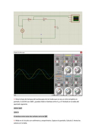 Este documento describe los pasos para simular y analizar un circuito RLC en serie usando Proteus. Incluye conectar el circuito con resistencia de 1kΩ, inductancia de 56mH y condensador de 470nF a una fuente de tensión alterna de 5V y 500Hz. Luego mide y captura las tensiones y desfases en cada elemento a través del osciloscopio mientras varía la frecuencia para determinar la resonancia y respuesta en frecuencia. El objetivo es analizar el comportamiento del circuito RLC serie.