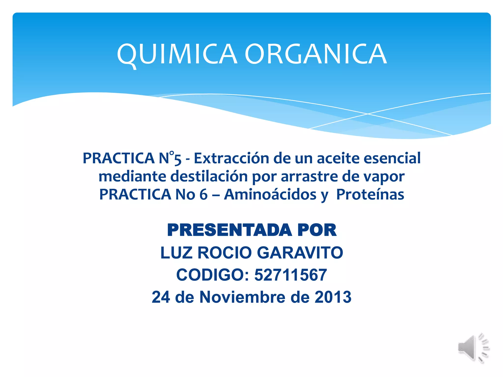Este documento presenta los resúmenes de dos prácticas de laboratorio de química orgánica realizadas por Luz Rocio Garavito. La primera práctica involucra la extracción de un aceite esencial mediante destilación por arrastre de vapor. La segunda práctica evalúa aminoácidos y proteínas a través de varias pruebas cualitativas. El documento también incluye información sobre aceites esenciales, sus usos y propiedades.