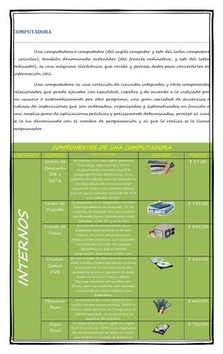 Este documento describe los componentes principales de una computadora, incluyendo una descripción de cada uno y su precio. Explica que una computadora es una máquina electrónica que procesa datos para convertirlos en información útil y está compuesta de circuitos integrados y otros componentes. Luego enumera y describe los componentes internos como la tarjeta madre, procesador, memoria RAM, disco duro y unidades externas como teclado, ratón, monitor e impresora.