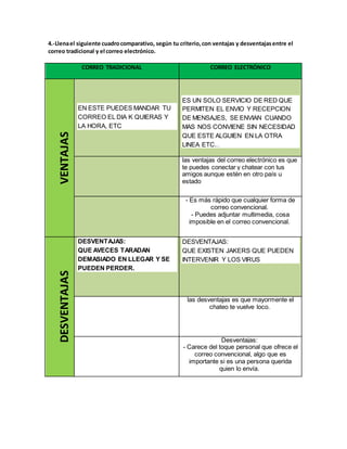 Este documento proporciona información sobre el correo electrónico. Explica que el correo electrónico permite la comunicación entre usuarios a través de buzones virtuales y describe sus elementos clave como el usuario, dominio y servidor. También compara las ventajas y desventajas del correo electrónico frente al correo tradicional, e identifica a proveedores populares de correo electrónico gratuito como Gmail y Yahoo Mail.