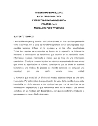 Este documento describe una práctica de laboratorio sobre medidas de peso y volumen. Los estudiantes aprenderán a usar instrumentos como balanzas, probetas graduadas, pipetas y buretas para pesar y medir objetos con precisión. La práctica involucra medir varios volúmenes y pesar objetos, así como responder preguntas sobre conceptos como exactitud, precisión y cifras significativas.