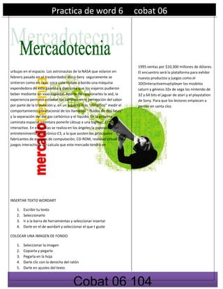 Este documento habla sobre varios temas. Primero, describe cómo Coca-Cola instaló una máquina expendedora a bordo del transbordador espacial Discovery para que los astronautas pudieran beber durante el vuelo y estudiar el comportamiento de los líquidos en gravedad cero. Segundo, menciona que la exposición E3 se llevó a cabo en Los Ángeles para exhibir nuevos productos y juegos de video. Por último, proporciona instrucciones sobre cómo insertar texto WordArt y colocar una imagen de fondo en Microsoft Word