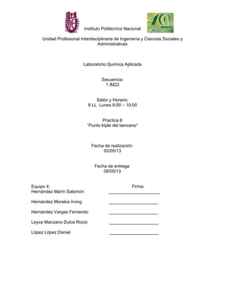 Este documento describe un experimento realizado por un equipo de estudiantes para determinar las condiciones de presión y temperatura del punto triple del benceno. El procedimiento involucró la instalación de un aparato de vacío con benceno y la observación de sus tres estados de agregación a medida que se reducía la presión y temperatura. Los resultados experimentales se compararon con los valores teóricos, encontrando una desviación mayor en la presión que en la temperatura. El equipo concluyó que lograron observar el punto triple pero que se necesita un equip