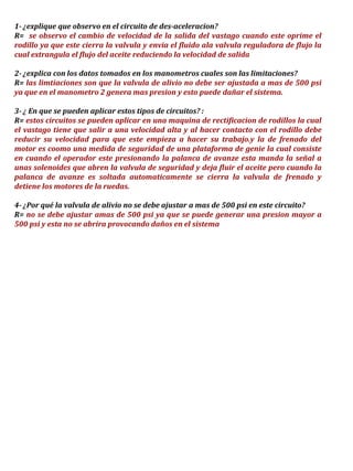 El documento describe dos circuitos hidráulicos. El primero es un circuito de desaceleración que usa una válvula para reducir la velocidad de salida de un vástago al oprimir un rodillo. El segundo es un circuito de frenado que detiene un motor hidráulico restringiendo el flujo a través de una válvula de regulación de presión. Ambos circuitos tienen una válvula de alivio ajustada a 500 psi para proteger el sistema de daños por exceso de presión.
