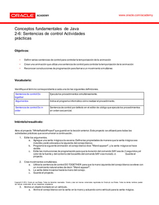 Este documento presenta varias actividades prácticas para practicar el uso de sentencias de control en Java para animaciones. Los estudiantes editarán un proyecto existente para agregar una varita mágica e implementar comandos como "aparecer" y movimientos simultáneos. Luego crearán más animaciones usando el conejo como vehículo y dejando que otros objetos se muevan. El objetivo es que los estudiantes aprendan a usar sentencias como DO TOGETHER y DO IN ORDER.