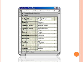 Este documento describe la creación de formularios en Microsoft Access. Los formularios organizan los datos de una base de datos y permiten ver, editar y agregar datos de manera fácil. Pueden crearse formularios mediante un asistente o diseñándolos manualmente en la vista diseño. Los formularios constan de un encabezado, detalles y pie de página, y permiten controlar propiedades como el nombre, visibilidad y estilo de los controles.