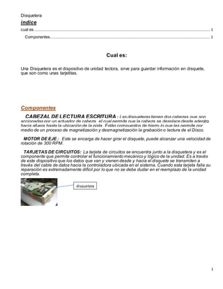 Este documento describe los componentes principales de una disquetera, incluyendo el cabezal de lectura y escritura que permite grabar y leer la información en un disquete mediante magnetización, el motor de eje que hace girar el disquete a 300 RPM, y la tarjeta de circuitos que controla el funcionamiento mecánico y lógico de la unidad y transmite los datos entre el disquete y la computadora.