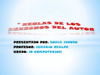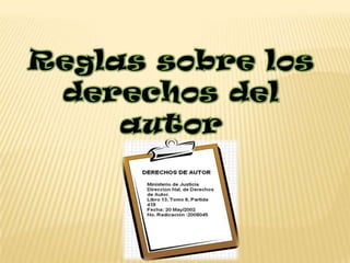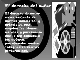 El documento habla sobre los derechos de autor y las diferentes clases de derechos que existen. Menciona los derechos patrimoniales, que permiten la explotación exclusiva de una obra hasta cierto tiempo después de la muerte del autor, y los derechos morales, ligados al autor de manera personal e irrenunciables. También menciona los derechos conexos, que protegen a personas distintas al autor como artistas e intérpretes. Explica además que para que un contenido sea considerado de autoría debe estar marcado con símbolos como