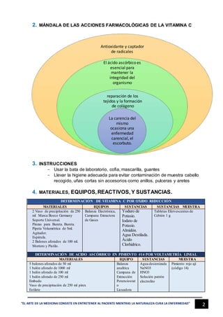 Este documento presenta los procedimientos para realizar diversas pruebas de calidad para determinar el contenido de vitamina C en tabletas y frutas. Se describen los materiales, reactivos y procedimientos para realizar las pruebas de oxidación-reducción, voltamperometría, ensayos analíticos y espectrofotometría para medir la vitamina C en tabletas, pimientos y otros frutos. El objetivo es evaluar la calidad y cantidad de vitamina C para garantizar la inocuidad de los medicamentos y alimentos durante su vida