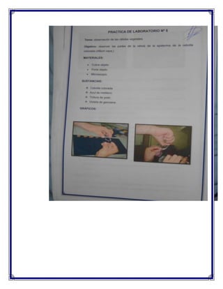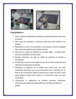 El documento describe un procedimiento para observar la epidermis de una cebolla al microscopio. Se detallan los pasos para preparar la muestra, colocarla en el microscopio y realizar observaciones a diferentes aumentos. Las observaciones muestran que las células de la epidermis de cebolla son alargadas y grandes, con membranas y núcleos visibles. El análisis concluye que se pudo observar la composición celular de la cebolla usando un colorante.