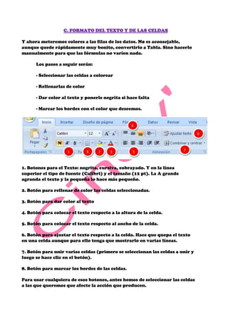 Este documento describe cómo dar formato a una hoja de cálculo. Explica cómo ajustar la orientación, márgenes, formato de texto y celdas, ancho de columnas, alto de filas y bordes de celdas. También cubre cómo editar elementos de una hoja de cálculo insertando tablas, ilustraciones, gráficos y vínculos o configurando funciones.