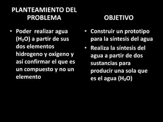Este documento describe un experimento para sintetizar agua (H2O) a partir de sus elementos constituyentes, hidrógeno y oxígeno. Explica los materiales y procedimientos utilizados, incluida la producción separada de hidrógeno y oxígeno y su combinación para formar agua. Los resultados muestran que el objetivo de sintetizar una pequeña cantidad de agua se logró con éxito siguiendo las instrucciones.