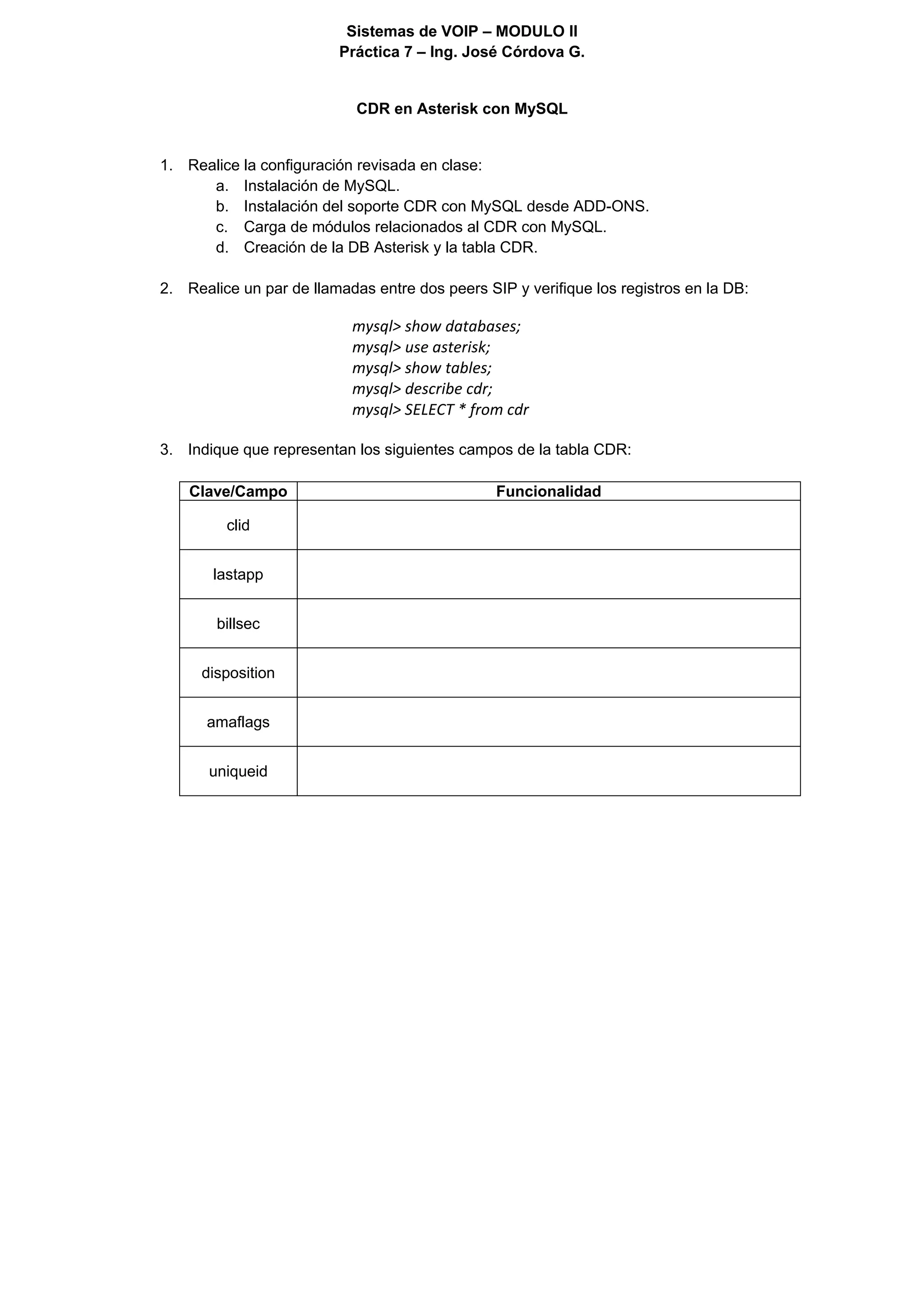 Este documento describe los pasos para configurar el registro de llamadas (CDR) en Asterisk utilizando una base de datos MySQL. Instruye al lector sobre cómo instalar MySQL y el módulo CDR de Asterisk, crear una base de datos y tabla CDR, y realizar llamadas de prueba entre peers SIP para verificar los registros CDR en la base de datos. Luego explica el propósito de algunos campos clave en la tabla CDR como clid, lastapp, billsec, disposition, amaflags y uniqueid.
