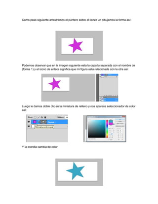 Este documento proporciona instrucciones para varias tareas en Photoshop, incluyendo cómo dibujar una capa de imagen, ajustar el trazado de una forma, añadir o restar áreas de formas, controlar la apariencia de una forma con estilos de capa, usar la varita mágica y la herramienta marco, y crear una máscara vectorial. Explica los pasos para seleccionar herramientas, colores, formas y opciones para modificar imágenes y capas.