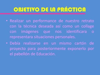 Este documento describe el performance y collage realizados por Cristina Santana como parte de una práctica. El performance consistió en un autorretrato con la técnica de puntos en rotulador sobre una fotografía. El collage incluyó imágenes como flores, mariposas, un puente y un reloj que representan cosas que le gustan o identifican a Cristina, como la naturaleza, viajar y la puntualidad.
