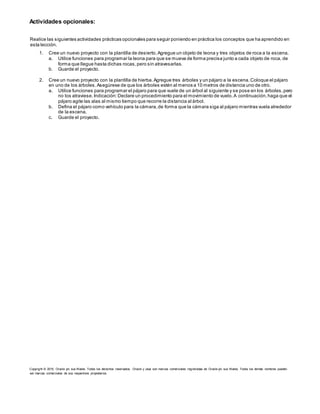 Este documento presenta actividades prácticas para utilizar funciones en Java para controlar el movimiento de objetos. Se instruye al usuario a abrir un proyecto existente y utilizar funciones como getDistanceTo y getDepth para hacer que un conejo se mueva hacia un seto sin chocar y evitar colisiones usando cálculos matemáticos. También se sugieren actividades opcionales como hacer que un pájaro vuele de árbol en árbol sin atravesarlos y seguirlo con la cámara.