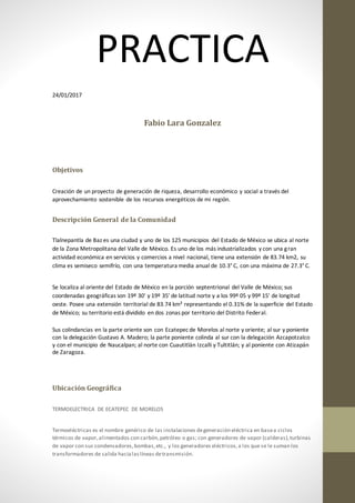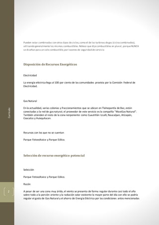 El documento describe un proyecto para implementar un parque fotovoltaico y eólico en Tlalnepantla de Baz, México para aprovechar los recursos energéticos renovables de la región de manera sostenible. Actualmente, la electricidad y gas natural llegan al 100% de las comunidades pero no se aprovechan los recursos eólicos y solares. Un parque renovable sería más eficiente energéticamente y no tendría emisiones de CO2 como la planta termoeléctrica existente.