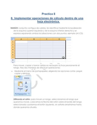 Este documento describe cómo implementar operaciones de cálculo y automatizar procesos dentro de una hoja de cálculo electrónica. Se explica cómo seleccionar rangos de celdas, editar datos existentes mediante gráficos y SmartArt, crear fórmulas usando funciones para sumar, restar, multiplicar y dividir automáticamente, y crear y editar macros para automatizar procesos.