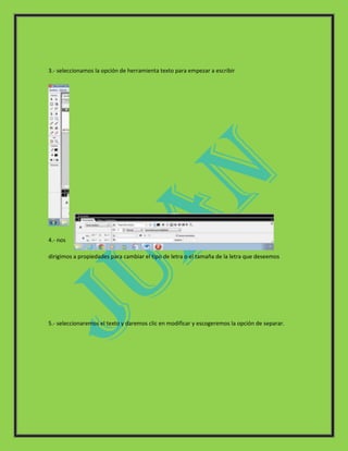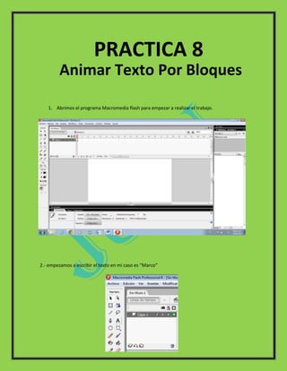 El documento describe los pasos para animar texto por bloques en Macromedia Flash. Estos incluyen 1) abrir Flash, 2) escribir el texto, 3) seleccionar la herramienta de texto, 4) cambiar la fuente y tamaño, 5) separar el texto en bloques, 6) convertir los bloques en símbolos, 7) copiar y pegar cada símbolo en su propia capa y 8) arrastrar los fotogramas para animar la secuencia de letras.