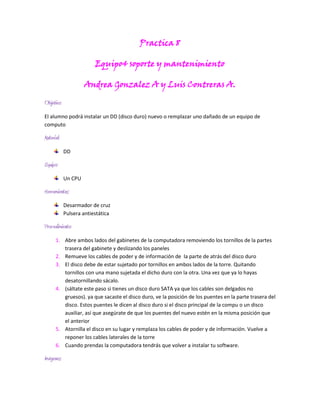 Este documento proporciona instrucciones para instalar un nuevo disco duro o reemplazar uno dañado en una computadora. Explica los pasos para abrir la computadora, desconectar y retirar el disco duro anterior, instalar el nuevo disco duro asegurándose de colocar los puentes en la misma posición, volver a conectar los cables y cerrar la computadora. Recomienda reinstalar el sistema operativo y cualquier otro software necesario una vez completada la instalación física del disco duro.