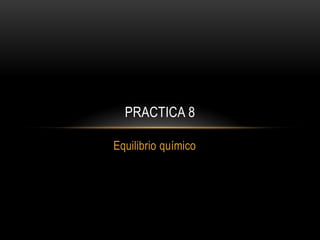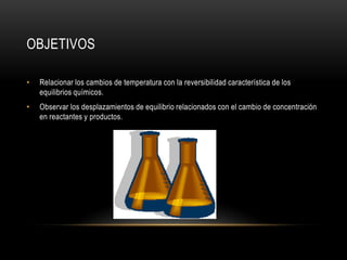 Este documento describe dos experimentos sobre equilibrio químico. El primer experimento estudia cómo cambios de temperatura afectan el equilibrio de una solución de CoCl2.6H2O en alcohol isopropílico mediante la adición de agua o ácido clorhídrico. El segundo experimento examina los efectos de agregar diferentes reactivos como NH4Cl, NH4SCN o NH4OH a soluciones de FeCl3 y NH4SCN. Los experimentos buscan ilustrar cómo los cambios de temperatura y concentración afectan el despl