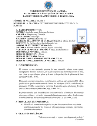 Este documento describe un experimento para determinar la presencia de cianuro en muestras de yuca mediante reacciones cualitativas. El estudiante realizó un circuito eléctrico conectando cables a un pedazo de yuca sumergido en agua para ver si se encendía un foco, lo que indicaría la presencia de cianuro. Los resultados mostraron que el foco se encendió, lo que significa que la muestra contenía cianuro. El estudiante concluyó haber completado con éxito la práctica para