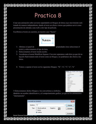 Este documento proporciona instrucciones para crear una animación de texto dividiendo las letras en bloques individuales que se mueven de forma independiente, dando al texto un efecto vistoso. Se explican los pasos para separar el texto "Karen" en bloques individuales ("K", "a", "r", "e", "n"), crear capas para cada bloque y asignarles movimientos en diferentes fotogramas para que se animen de forma secuencial.
