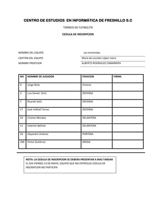 El documento es una cédula de inscripción para un torneo de fútbolito en el Centro de Estudios en Informática de Fresnillo. Contiene los nombres del equipo participante "Las tremendas", su capitán María de Lourdes López Rivera, el profesor Alberto Rodríguez Zamarripa, y la lista de 10 jugadores con sus posiciones y firmas.