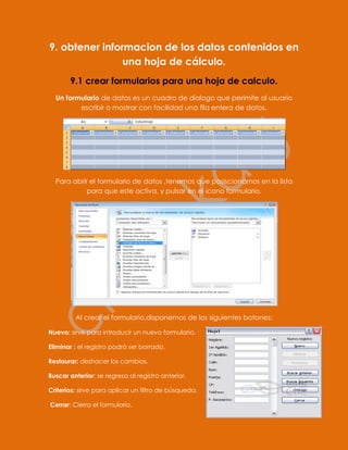 Este documento proporciona instrucciones para obtener y manipular datos en una hoja de cálculo de Excel. Explica cómo crear formularios para ingresar datos, editar formularios existentes, buscar datos específicos, aplicar filtros para consultar datos, crear tablas dinámicas con los datos y editar tablas existentes.