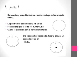 El documento proporciona instrucciones en 4 pasos para crear un reloj animado en el que las manecillas (incluyendo la de los segundos) se mueven automáticamente. Primero se dibuja el reloj y las manecillas, luego se usa la herramienta de subselección para mover la manecilla de los segundos cada 6 espacios en la línea de tiempo, repitiendo este proceso hasta llegar a las 12. Finalmente, presionando F12 la pantalla muestra el reloj completamente animado.