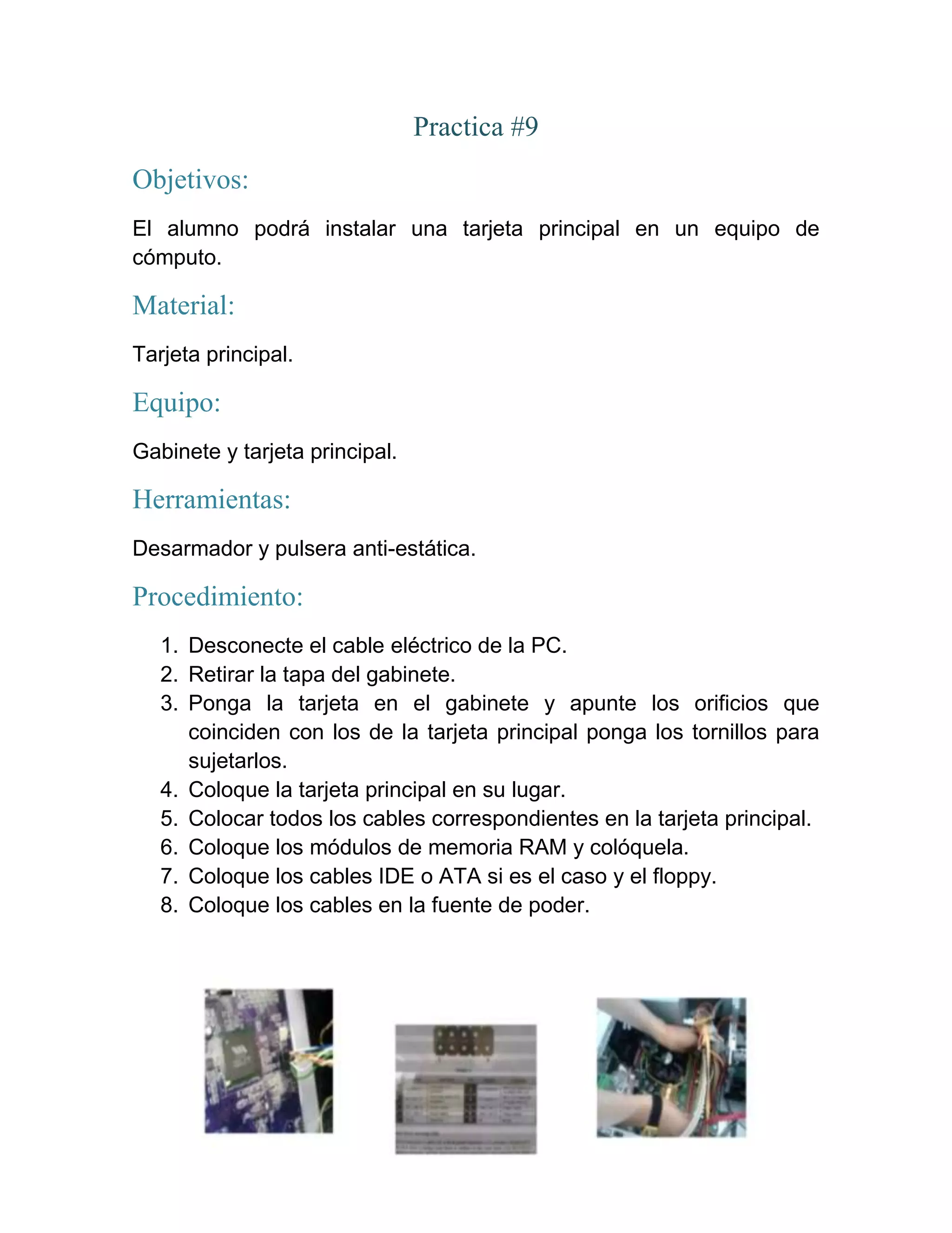 La práctica #9 tiene como objetivo que los alumnos aprendan a instalar una tarjeta principal en un equipo de cómputo, colocando primero la tarjeta en el gabinete y sujetándola con tornillos, luego conectando todos los cables correspondientes como la RAM, IDE, y fuente de poder.