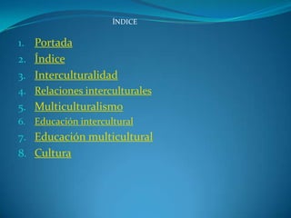 El documento trata sobre los conceptos de interculturalidad, relaciones interculturales, multiculturalismo, educación intercultural y educación multicultural. Define la interculturalidad como un proceso de interacción entre grupos culturales donde ninguno está por encima del otro, favoreciendo la integración y convivencia. Las relaciones interculturales se basan en el respeto a la diversidad y el enriquecimiento mutuo aunque también pueden generar conflictos. El multiculturalismo se refiere a la coexistencia de culturas en una misma entidad política y a políticas que promue