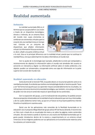 Este documento describe la realidad aumentada y su aplicación en la educación. Define la realidad aumentada como la combinación de elementos virtuales con el entorno físico en tiempo real a través de dispositivos tecnológicos. Explica que la realidad aumentada mejora el aprendizaje al permitir a los estudiantes interactuar directamente con los contenidos. Como ejemplo, menciona el proyecto Magic Book que permite a los estudiantes ver contenidos virtuales sobre páginas reales de libros. Finalmente, concluye que la realidad aumentada debe implementarse más ampl