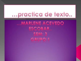 Este documento habla sobre la práctica de texto de Marlene Acevedo Escobar en el semestre 3 del grupo 1. Describe la imagen original, el color de la letra y la aplicación de lienzo, mosquitero y pintura subyacente en el trayecto.