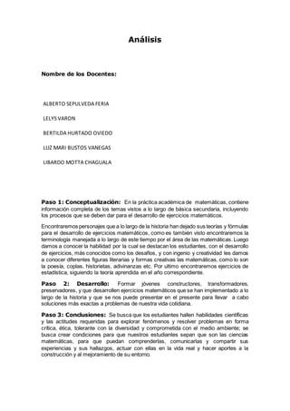 Este documento presenta un análisis de tres pasos para la práctica académica de las matemáticas. El primer paso conceptualiza la información completa sobre los temas de matemáticas vistos en la educación básica y secundaria. El segundo paso busca formar estudiantes que puedan desarrollar ejercicios matemáticos implementados a lo largo de la historia para resolver problemas cotidianos. El tercer paso concluye que se busca que los estudiantes desarrollen habilidades científicas y actitudes para explorar