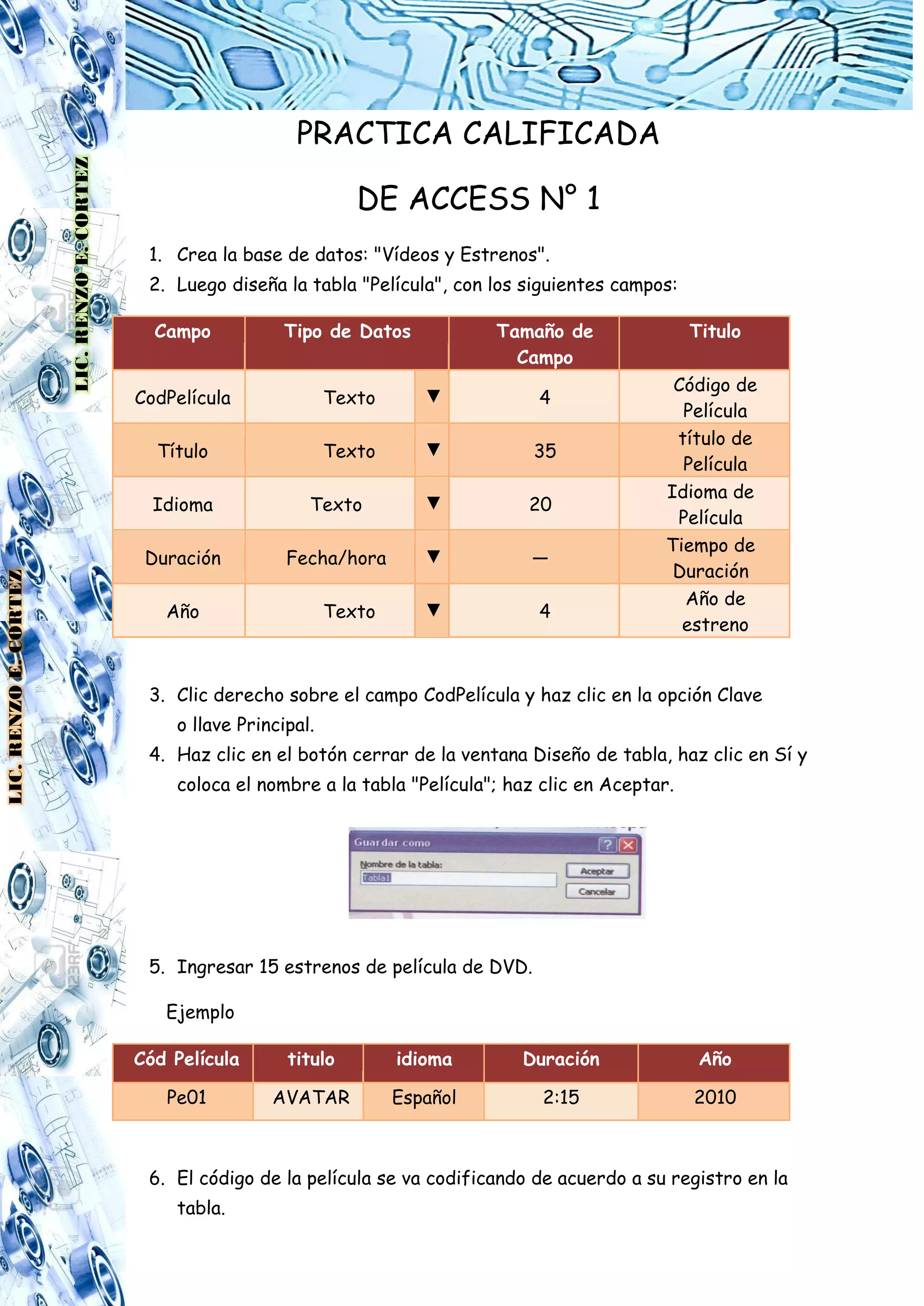 El documento proporciona instrucciones para crear varias tablas en una base de datos de Access sobre películas y estrenos. Estas incluyen tablas para películas, pedidos, clientes, actores, protagonistas y distritos, con campos y claves primarias especificados. Se proporcionan ejemplos de cómo ingresar datos en cada tabla.