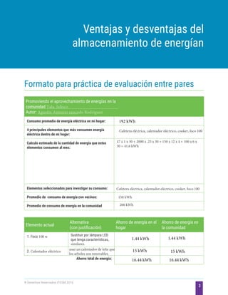 Este documento describe el consumo de energía en un hogar y la comunidad de Tala, Jalisco. Calcula que los principales elementos que consumen energía en el hogar son la cafetera eléctrica, calentador eléctrico, cocina y foco de 100W, los cuales consumen 41.6 kWh al mes. También analiza alternativas para ahorrar energía reemplazando el foco de 100W por LED y usando un calentador de leña, lo que podría ahorrar 1.44 kWh en el hogar y 15 kWh en la comunidad cada
