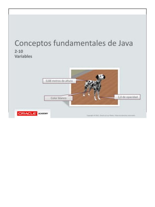 Las variables permiten almacenar información de un tipo específico que puede ser accedida y modificada a través de su nombre. En Alice 3, al crear una variable se le debe asignar un valor inicial y su tipo de dato define qué tipo de información puede almacenar. Las variables son útiles en programación ya que permiten cambiar su comportamiento modificando su valor.