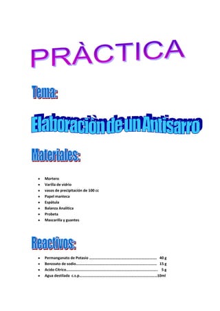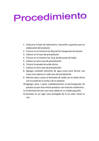 Este documento proporciona instrucciones para elaborar un anti sarro casero utilizando permanganato de potasio, benzoato de sodio y ácido cítrico. Describe los pasos para triturar y mezclar los ingredientes formando una masa sólida, la cual se coloca en el tanque de agua para limpiar y proteger las paredes del inodoro del sarro de manera segura y sin productos químicos corrosivos. El anti sarro se irá diluyendo en el agua limpiando el inodoro con la ayuda de un cep