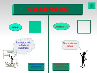 Este documento presenta fórmulas y ejemplos para calcular el área y perímetro de varias figuras geométricas planas, incluyendo cuadrados, rectángulos, rombos, triángulos, trapecios, polígonos regulares y círculos. Explica cómo calcular el área multiplicando las medidas apropiadas y el perímetro sumando los lados. También incluye ejercicios prácticos para que los estudiantes apliquen estas fórmulas geométricas básicas.
