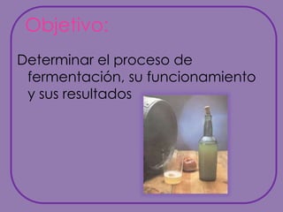 El documento describe un experimento sobre la fermentación. El objetivo era determinar el proceso de fermentación y sus resultados. Se colocó una mezcla de fruta y canela en una botella con agua y azúcar. Al iniciar la fermentación, el globo conectado a la botella comenzó a inflarse con dióxido de carbono, y el nivel del agua ascendió. Luego de 7 días, el globo permaneció casi igual y el agua estaba en el fondo, demostrando que la fermentación había ocurrido. La fermentación convierte bi