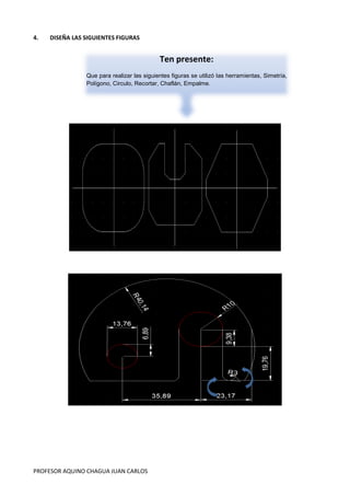 El documento instruye al estudiante a realizar un vehículo en AutoCAD, dibujar la misma figura mostrada, diseñar arcos con medidas específicas, y diseñar figuras adicionales usando herramientas como simetría, polígono, círculo, recortar, chaflán y empalme. El profesor Juan Carlos Aquino Chagua supervisará la práctica calificada número 02.