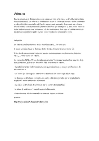 Una cola es una estructura de datos en la que los elementos se insertan en un extremo y se extraen del otro, siguiendo el orden FIFO (primero en entrar, primero en salir). Se implementan como listas enlazadas y se usan en sistemas informáticos y procesos donde los objetos deben procesarse en orden. Un árbol es una estructura de datos formada por nodos conectados, donde cada nodo puede tener cero o más nodos hijos. La raíz es el único nodo sin padre y las hojas son nodos sin hijos