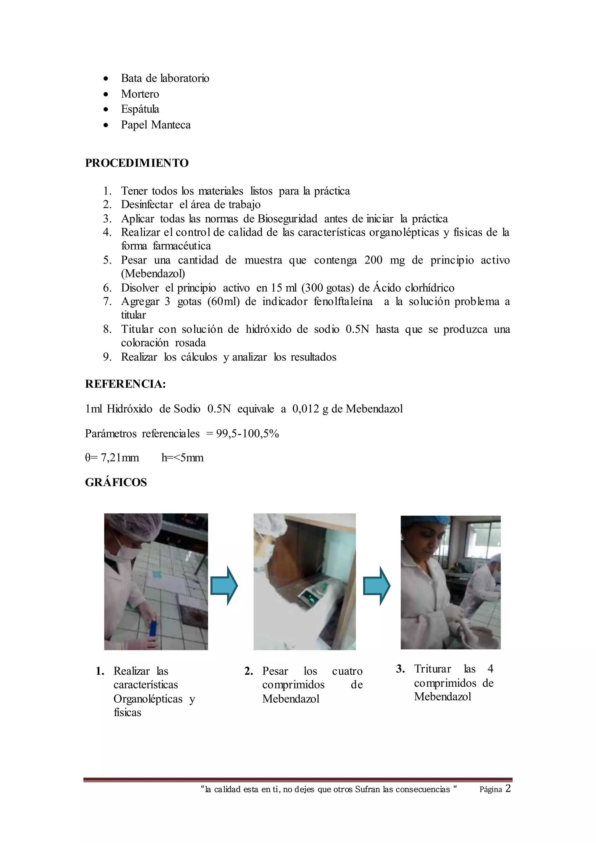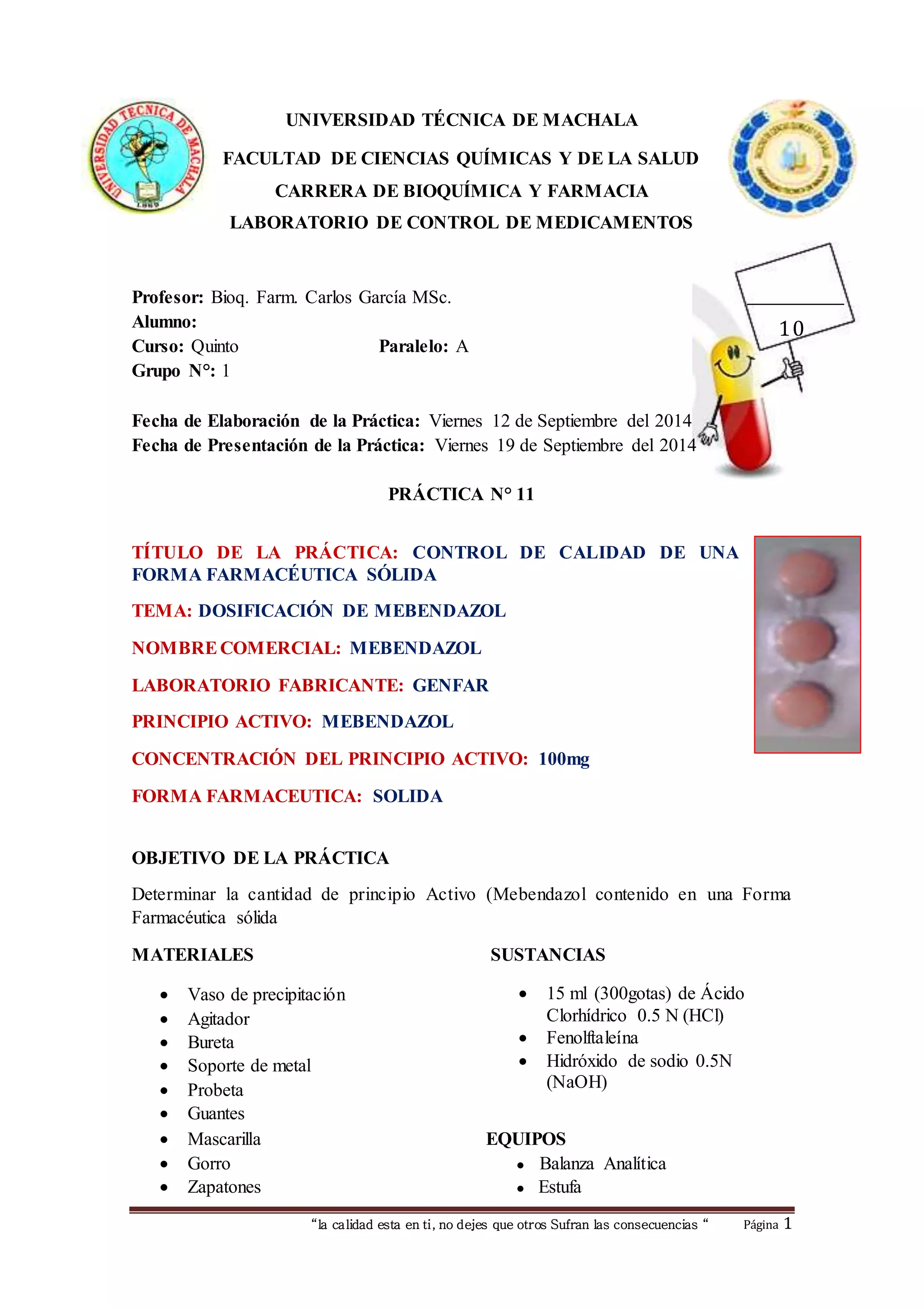 1) La práctica evaluó la dosificación de mebendazol en comprimidos de 100 mg mediante titulación ácido-base para determinar el porcentaje de principio activo. 2) Los resultados mostraron que el porcentaje de mebendazol fue 62.95%, el cual cumple con los parámetros de calidad establecidos. 3) Adicionalmente, se realizaron pruebas de características organolépticas y físicas que determinaron que el medicamento cumple con los estándares requeridos.